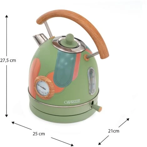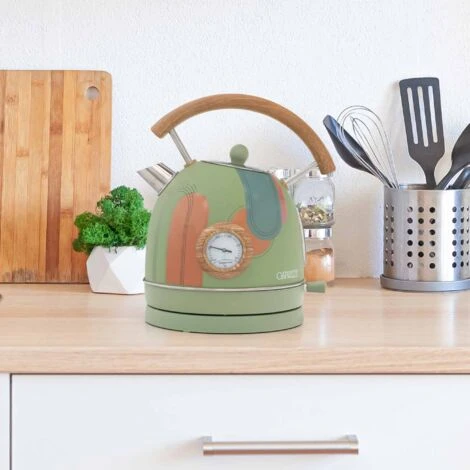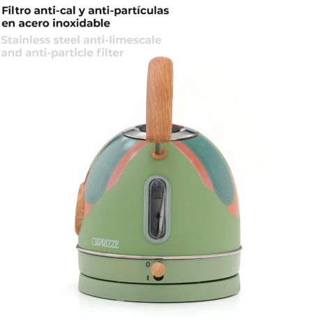 Un grande design unito alla migliore qualità. Il bollitore ad acqua calda ha una potenza elevata che consente di riscaldare l’acqua a 100º in 5,30 minuti, in modo da poter gustare rapidamente il proprio infuso preferito. È dotato di un filtro anticalcare rimovibile e lavabile che garantisce acqua pulita e insapore. La sua grande capacità di 1,8 l consente di non dover riscaldare costantemente l’acqua. Inoltre, il suo design vintage con finiture opache e in legno aggiungerà un tocco di originalità alla vostra cucina. Questo bollitore in acciaio è dotato di un termometro integrato per controllare la temperatura e di una finestrella per individuare la giusta quantità di acqua. Il suo sistema di spegnimento automatico è in grado di rilevare il surriscaldamento e di spegnere il dispositivo.nnCaratteristiche:n- Dimensioni: 25x21x27,5 cm.n- Materiale: acciaio inox e polipropilene.n- Senza BPAn- Capacità: 1,8 L massimo.n- Colore: verde opaco con decorazioni arancioni e dettagli effetto legno.n- Peso: 1,08 kg.n- Potenza: 2200 W.n- Temperatura di lavoro: 100° C.n- Sistema di sicurezza: Autoshutoff.n- Filtro: acciaio inox.n- Lunghezza del cavo: 75 cm con protezione integrata.n- Certificati: CE, GS, LFGB e RoHS.