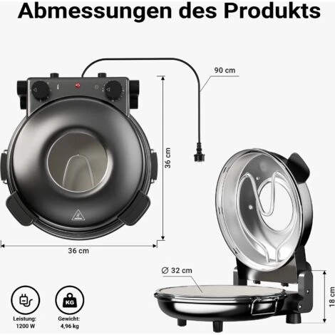 | Applicazione / Informazione / Caratteristiche | Temperatur einstellbar, max. 400°C Vorwärmfunktion Thermostat mit Kontrollleuchte Einstellbarer 30-Minuten-Timer mit Alarmfunktion Für Pizza, Flammkuchen, Fladen, Brot, Kuchen, Gebäck, Fleisch u.v.m. |
