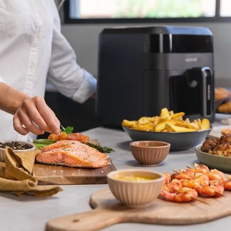 Friggitrice ad aria con display di cottura dal design unico che si illumina durante la cottura degli alimenti.