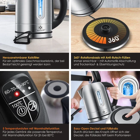 Questo bollitore in acciaio inossidabile di alta qualità di KESSER è dotato delle ultime tecnologie. La temperatura dell’acqua può essere impostata individualmente in base alle proprie esigenze in anticipo, in modo da poter impostare la temperatura dell’acqua ottimale per ciascuna delle bevande desiderate. Grazie alla funzione di riscaldamento integrata, non è necessario far bollire l’acqua per ogni tazza, ma si può avere una temperatura dell’acqua continua di 85 gradi per 2 ore. Il beccuccio dalla forma ottimale garantisce che si possa versare senza far gocciolare nulla. Il filtro anticalcare integrato evita un sapore di calcare in polvere nella vostra bevanda, così da poterla gustare appieno. Il pannello di controllo semplice e chiaro è strutturato in modo semplice ed è adatto sia per destrorsi che per mancini. La temperatura selezionata viene visualizzata sulla spia rossa. Il bollitore KESSER ha un proprio colore per l’illuminazione interna per ogni temperatura regolabile. L’individualità e la varietà assicurano un ambiente straordinario.