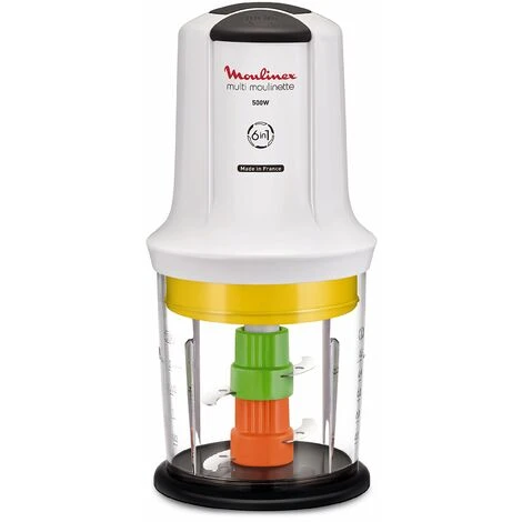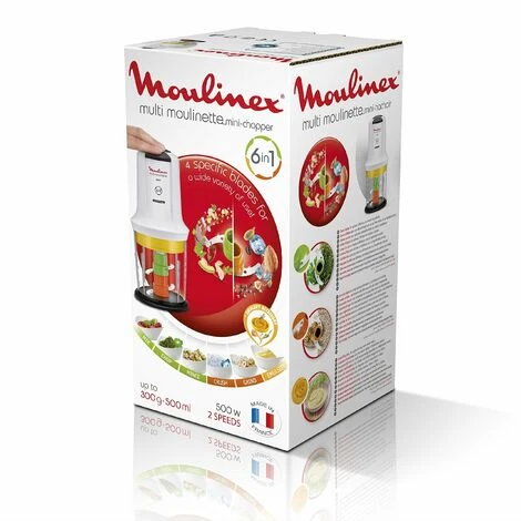 Multi Moulinette consente di preparare gli alimenti in 6 modi diversi con un solo apparecchio le 2 lame affilatedel tritatutto elettrico sono ideali per sminuzzare le erbe aromatiche, frullare le verdure e tritare la carne, le lameseghettate, invece, sono state studiate per macinare le spezie o i chicchi di caffè e tritare il ghiaccio, infine,l’accessorio salse permette di preparare deliziose salse perfettamente emulsionate. Multi Moulinette è un minitritatutto compatto, ma dispone di un potente motore da 500W e di un ampio recipiente da 300g/500ml.