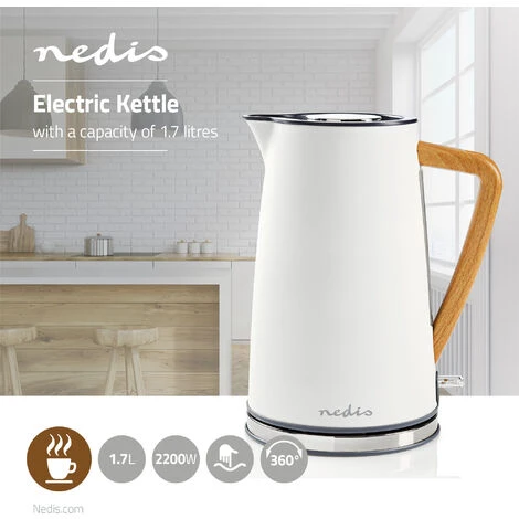 Questo elegante e potente bollitore elettrico Nedis è gradevole nell’aspetto e funziona altrettanto bene: presenta un’ampia capacità di 1,7 l, offre tempi di bollitura rapidi ed è progettato per ridurre al minimo qualsiasi accumulo di calcare. La combinazione di finiture in acciaio inossidabile, legno e gomma in tinta rende il nostro bollitore un complemento elegante, durevole e facile da pulire per la tua cucina. È progettato per contenere una quantità di acqua sufficiente per sei-otto tazze per ogni bollitura, in modo che nessuno degli ospiti debba attendere troppo a lungo la propria tazza di tè o caffè.